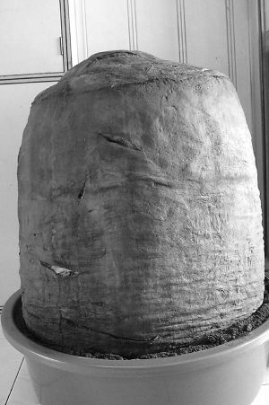 昨天,记者来到于先生存放“太岁”的地方,见此物高约82厘米,直径46厘米,重达130多公斤。外形呈圆柱状,表皮为土黄色泛红,内部为乳白色似菌类组织的百叶结构。这个“太岁”富有弹性,用手摸一下感觉发凉,还湿乎乎的。于先生开玩笑地说:“要是搂着它睡觉一定很凉爽。”几天前,于先生取样时发现,“太岁“顶部有几处裂纹,现在已悄悄地”愈合“。自从捡到这个“宝贝”,于先生小心呵护,特意买来特大号盆放上泥土给它临时安了个家。尽管这样,他还是放心不下,担心这件稀罕物儿烂掉。他希望专家能提供一些培养太岁的方法,并对其在药用、保健等价值方面做进一步的研究。