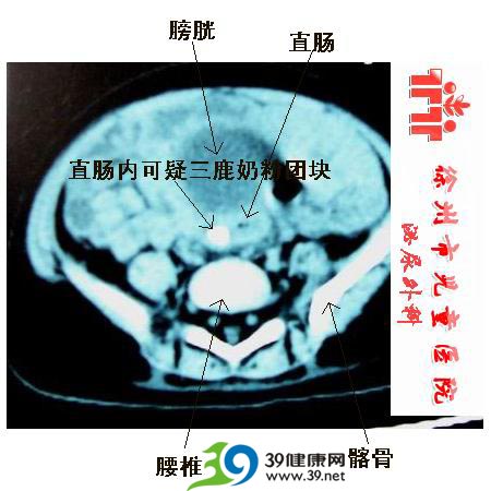 这是一个吃三鹿奶粉肾结石患儿的CT平扫片。患儿只吃三鹿奶粉,近期无补钙史。直肠内可见斑块影,高度怀疑为三鹿奶粉肠道内凝结块。(已经基本排除此斑块位于输尿管内可能)
