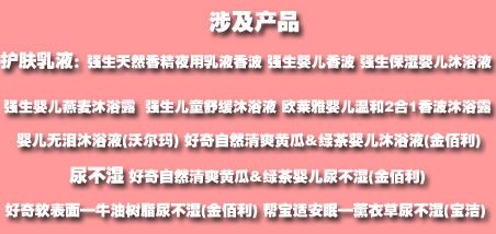 护肤乳液:强生天然香精夜用乳液香波 强生婴儿香波 强生保湿婴儿沐浴液 强生婴儿燕麦沐浴露 强生儿童舒缓沐浴液 欧莱雅婴儿温和2合1香波沐浴露 婴儿无泪沐浴液(沃尔玛) 好奇自然清爽黄瓜&绿茶婴儿沐浴液(金佰利)