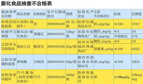 日前,辽宁省工商局委托辽宁省产品质量监督检验院、沈阳产品质量监督检验院对鞍山、抚顺、本溪、丹东、辽阳、铁岭、沈阳等市市场上经销的膨化食品、油炸小食品等儿童食品质量进行了专项抽查。