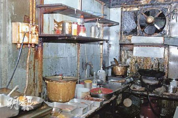 外卖食品工场卫生恶劣,墙身发黑,食物随处摆放,厨具布满厚厚的污渍。