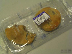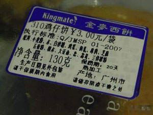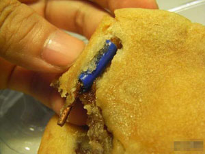 近日,一位消费者在广州金麦西饼店买到一盒鸡仔饼,吃了一半之后惊觉鸡仔饼里面含有一个电线头。照片显示,电线头外还包着蓝色的绝缘层,一端露出里面的铜线。