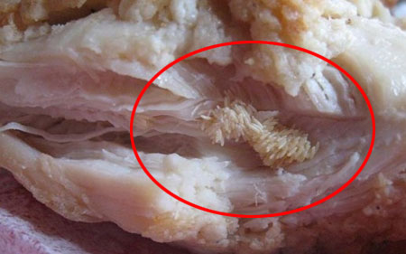 那天我跟朋友一起去家里附近的一家KFC,照列叫了汉堡和鸡块。隔壁坐着一个男生在吃鸡块,突然他就叫“服务员,过来一下。”服务员没搭理他,结果他自己就跑去请了服务员过来。服务员就过来后,他就说:“你看你这个鸡块怎么会有长这个东西?你要我们怎么吃得下去?”我瞄了一下。服务员说:“不好意思,这可能是……不小心弄到的虫子……”那个男生就大叫:“什么,这长在肉里面的怎么可能是不小心弄到的?这根本就是之前长里面的!”