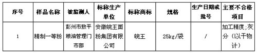 成都市工商行政管理局2009年3季度对成都市范围内流通领域销售的小麦粉产品进行了抽检,发现标称由安徽皖王面粉集团有限公司生产的一批次“皖王”精制一等粉,加工精度、灰分项目不符合国家有关标准要求。