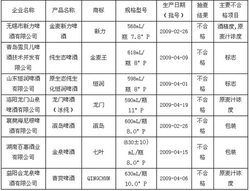 本次共抽查了200款啤酒产品,共有7款啤酒不合格。其中无锡市新力啤酒有限公司生产的金麦新力啤酒因酒精度和原麦汁浓度不合格;青岛雪贝儿啤酒技术开发有限公司生产的纯生态啤酒和山东恒润啤酒有限公司生产的原生态纯生化恒润啤酒因标志不合格。