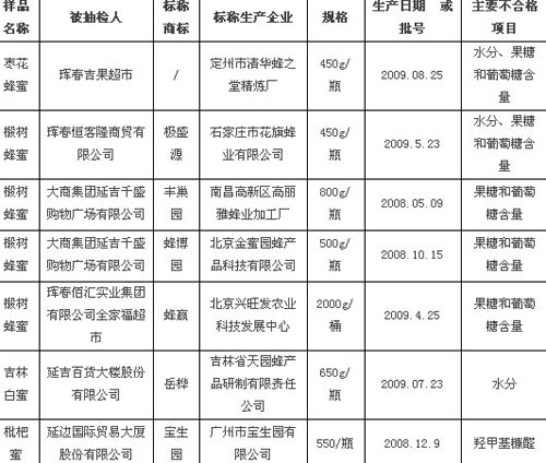 此次抽检了长春、延边、长白山等地14个经销单位,27个生产企业生产的50个批次的蜂蜜产品。经检验,43个批次产品合格,合格率86%。在7个批次不合格产品中,有5个批次产品的果糖和葡萄糖含量达不到标准规定要求,占不合格产品的71%。据了解,果糖和葡萄糖是蜂蜜中的主要成分,未经蜜蜂充分酿造的蜂蜜,以及在蜂蜜中掺入淀粉糖浆或砂糖,都会造成这项指标偏低。两款京产蜂蜜该项目不合格,如标称北京金蜜园蜂产品科技有限公司生产的一批次“蜂博园”椴树蜂蜜(500g/瓶 2008.10.15)、标称北京兴旺发农业科技发展中心生产的“蜂赢”椴树蜂蜜(2000g/桶 2009.4.25)。