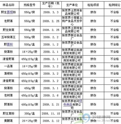 张家界市质量技术监督局2009年度葛根粉监督抽查检验结果汇总表不合格名单