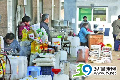 记者走到临街的一个香油店发现,店里面物品摆放杂乱无章、污迹斑斑,磨盘也没有工作,上面有一些污垢。店门口放着一张桌子,上面放着一排用盐水瓶装着的香油。看到顾客上门,店内的一名年轻男子热情地打着招呼:“大哥,要点香油吗?”“什么价格?”记者问道。