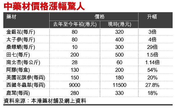 内地客来港扫中药材也是价格飙升的原因之一,香港田七零售价今年曾从每斤200元上升至800元,最近才回落至约400元至500元;7月以来山东青岛虫草价格每斤暴涨约2万元人民币,中药店的虫草售价最高曾卖到每克680元人民币,业界人士称贵过2克千足金。香港中药联商会理事长江俊鸿认为,内地消费者生活水平提高,对健康认识越来越深,带动中药需求量增加,惟价格跳升的很大原因还在于游资的炒卖。