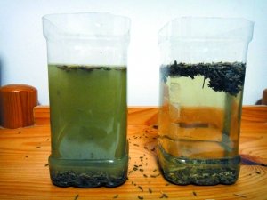 取出相同分量的孜然,泡入同样大小的清水瓶中,此时,A大部分沉在了水底,B则大部分漂在水面上。略加搅拌,十秒钟后,浸泡了A的水变成了浑浊的绿色,已不透明,刚才略带绿色的孜然完全变成了枯黄色;而浸泡了B的水只是变成了淡黄色,仍然透明。