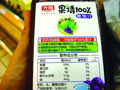 从北京媒体披露的信息来看,在北京销售的此种“果诱100%葡萄汁”中,被查出了违规添加的防腐剂山梨酸。在昨天的探访中,从外包装上看,在该超市销售的该品种果汁,应该就是被曝光的那种,至于是否是同一生产批号并不敢确定。为了证明自身果汁的天然纯正,在产品正面包装的右下角,厂家还特意浓墨重彩的写着“不添加人工色素防腐剂”的醒目提醒。在这行字的上方明确告知消费者,该果汁是“甄选优质鲜果原浆”,而在这行圆形标志的最下方又是一个大大的“100%”数字。在这款“光明”果诱100%葡萄汁的配料表中,记者注意到,其配料中标注的只有两个成分,一是水、二是葡萄浓缩汁。但从成分表中,消费者可以看到,这个果汁似乎真的很纯正。