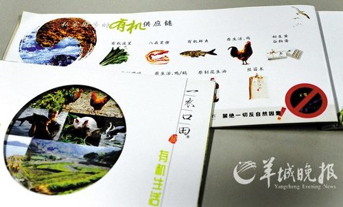 在田客餐厅所提供的“一衣口田”宣传册上,记者看到其内页图文并茂地展示自产的“有机蔬菜”、“有机鲜鱼”及“原生活鸡鸭鹅”等农产品。该餐厅的一名服务员说,陈列在销售架上的“有机丝苗米”(10斤装)售价为56元,由“一衣口田”生产的“有机蔬菜”售价为88元一箱(8斤装)。在餐厅一楼,记者看到有几位顾客购买了包括活鸡与鸡蛋在内的“一衣口田”的大量“有机”产品。据了解,经过精美包装的骟鸡,其售价高达168元一只。