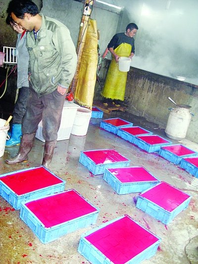记者询问这是何种原料,女工称,这是“消泡王”,是一种食品添加剂,做豆腐经常用这种东西。果然,经过搅拌后,鸭血就基本处理好了。女工将其倒进一个方形塑料筐里,令人吃惊的是,鸭血倒出来之后,颜色变得异常鲜红,如同刚刚杀鸭放出的血一样。而上面仅仅漂浮少许泡沫杂质。女工用一块小木条板将表层的杂质去掉,一盆新鲜的鸭血原料就此完成。