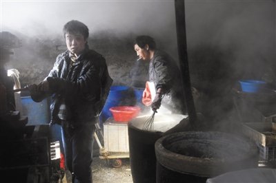 徐庄村一豆腐黑作坊内,两名智障劳工正在劳作。