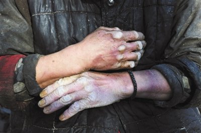 12月3日,通州台湖镇徐庄村一豆腐黑作坊内的一名智障工,双手变形浮肿,他称常被作坊老板殴打。