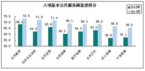 报告显示,在调查的十大类公共服务领域中,公众对公用事业的满意度依然最高(74.4分),公众满意度提升最为明显的是公共文化体育。对公共教育、市政规划的满意度次之;对公共安全的满意度最低(66.2分)。评价最高项与评价最低项的差距为8.2分,差距呈逐步缩小趋势(2010年最大差距11.1分,2009年最大差距13.9分)。