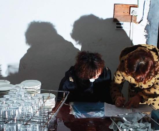 一位中年妇女称,她在这里做了近两年,每天能清洗1000多套餐具。隔壁一间房是餐具清洗间,里面灯光昏暗,餐具被随意堆放在地上,两位女工在水池边徒手清洗。记者在清洗过的调羹上看到一片残留着的菜叶。经过简单清洗后,餐具被搬去擦干包装,而房内两台消毒柜已经生锈。