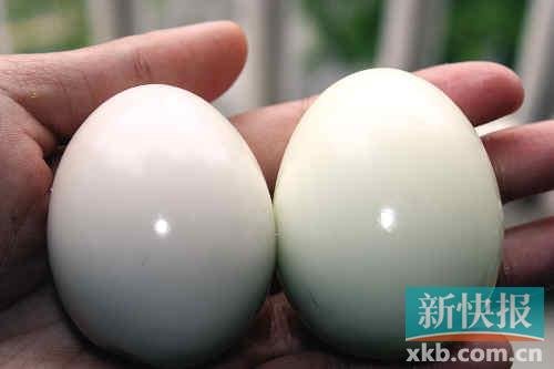 剥开煮熟后的鸡蛋,蛋白的颜色明显不一样。问题蛋呈灰白色,而普通蛋是带有光泽的奶白色。