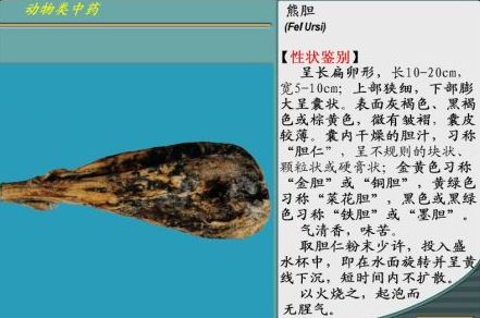 我国首部药典性本草——唐代的《新修本草》记载,传统中药熊胆为熊科动物黑熊或棕熊的干燥胆汁。熊胆味苦性寒,归肝、胆、心经。具有清热解毒,清肝名目,息风止痉的功效。现代科学发现,熊胆的主要成分为熊去氧胆酸、鹅去氧胆酸、牛磺熊去氧胆酸等。
