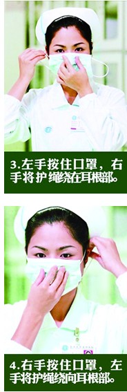 4、右手按住口罩,左手将护绳绕向耳根部。