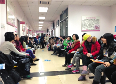 2013年12月26日,北京妇产医院,下午三点半仍有不少人在产科诊室外排队候诊。随着“单独二孩”的实施,大医院建档难等问题更加凸显。